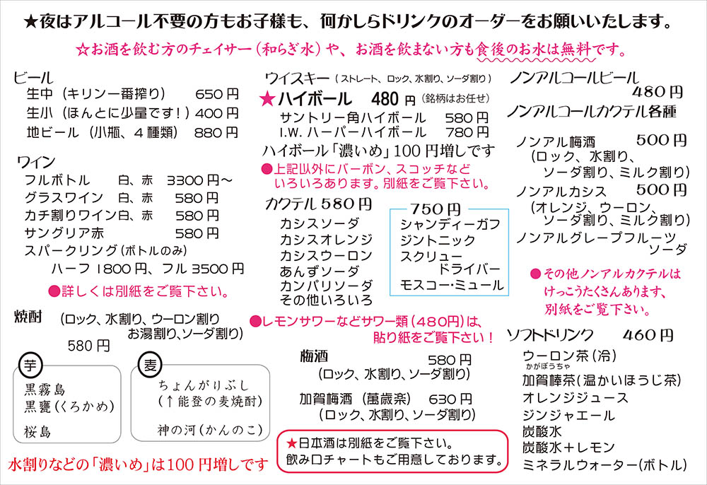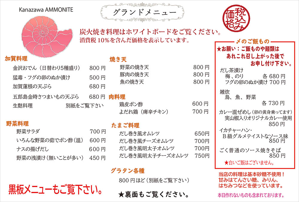 その他のメニューも豊富で、炭火焼きやおでんのほか、加賀料理や洋風、中華風などジャンルを問わずいろいろあります。